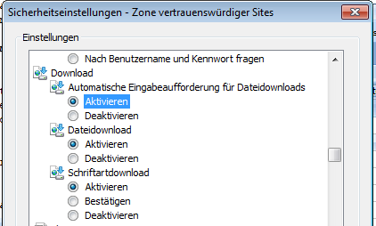Um das zu ermöglichen, muss in den Sicherheitseinstellungen des Internet Explorers 8 der Parameter „Automatische Eingabeaufforderung für Dateidownloads“ aktiviert sein.
