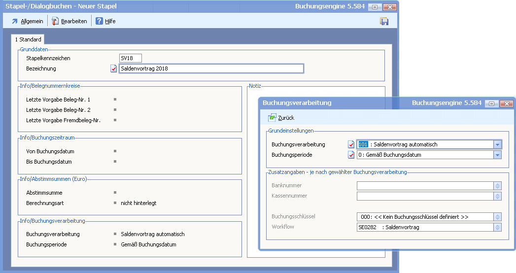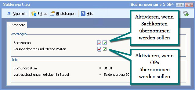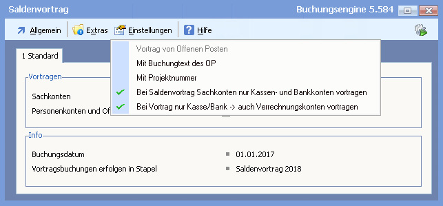 - „Bei Vortrag nur Kasse/Bank auch Verrechnungskonten vortragen“ -> führt dazu, dass auch Verrechnungskonten vorgetragen werden. (verfügbar ab Version 5.58)