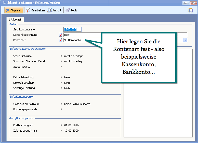 Ob ein Konto zu den Kassen-/Bank- oder Verrechnungskonten gehört, regelt ebenfalls die Kontenart auf der Hauptmaske.