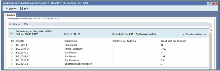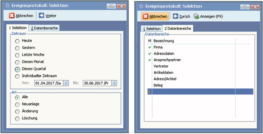 Die Ereignisse können nach Änderungsart, Datenbereichen und Zeitraum der Änderung selektiert werden.