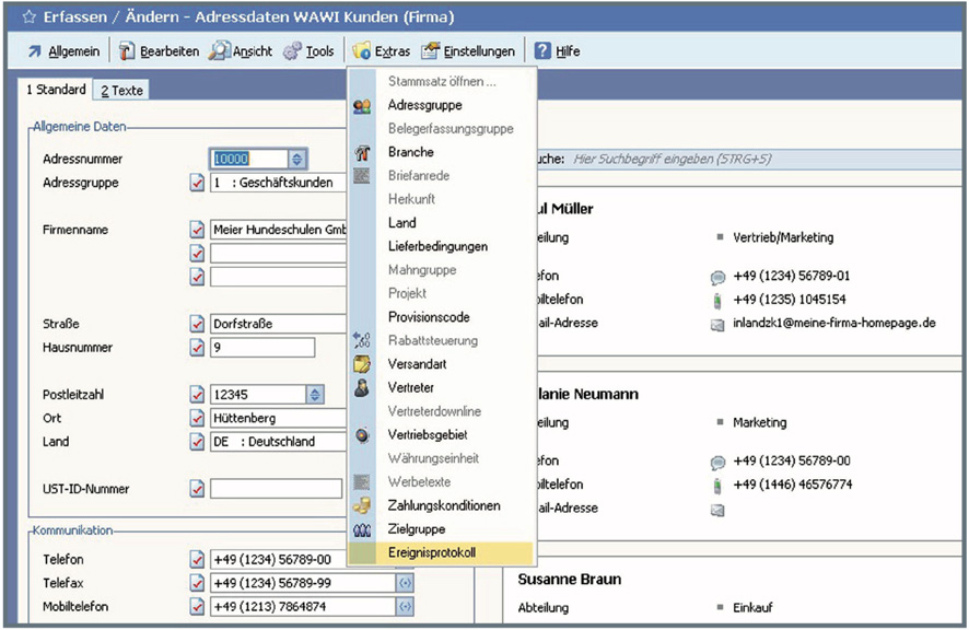 Die Ereignisdatenbank wird (wo verfügbar) über das Menü „Extras“ aufgerufen.